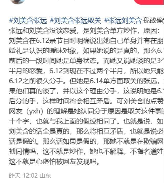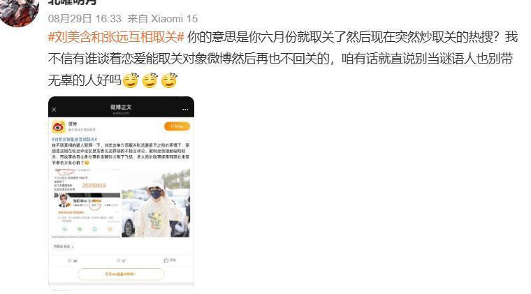 和赵天爱一样翻车的还有刘美含,刘美含七夕节当天发了一条看起来有些伤感的感情文案,提到了一些让人看不懂的数字,还引用了张远的一句歌词。