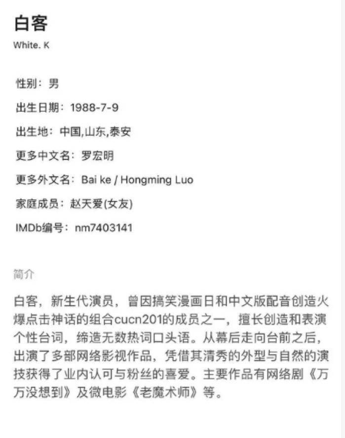 去年年初,白客被拍到和赵天爱多次一起下馆子,疑似恋爱,他在某平台简介的女友一栏上,还出现了赵天爱的名字。
